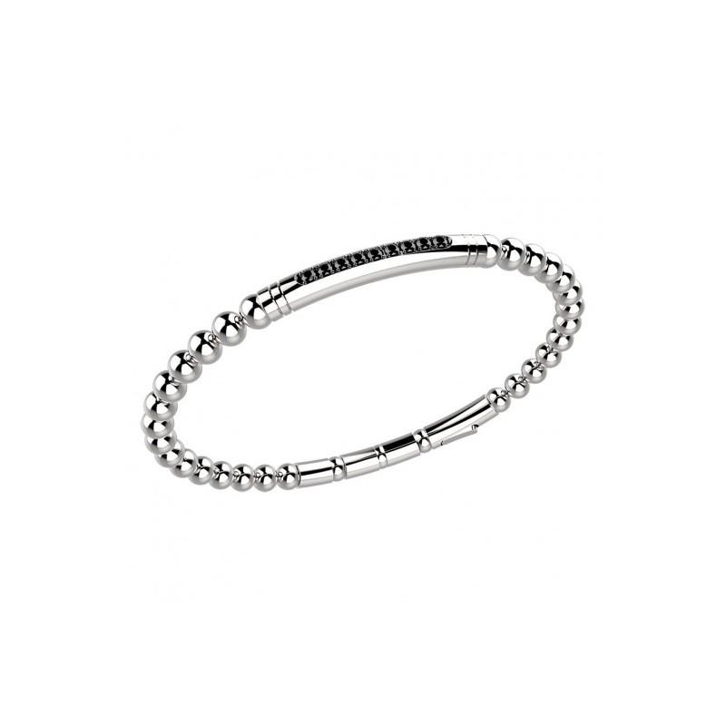Bracciale in acciaio con sfere e inserti tubolari in chiusura e nella placca centrale, fascia di spinelli neri al centro.
