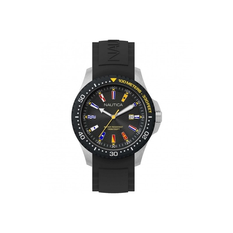 Orologio Solo Tempo Da Uomo Di Nautica Collezione Jones Beach. Cassa Del Diametro Di 44Mm In Acciaio, Indici A Bandierine, Fondello A Vite E Corona A Vite E Cinturino In Silicone. Orologio Con Resistenza All'Acqua Di 10 Atm con Datario
