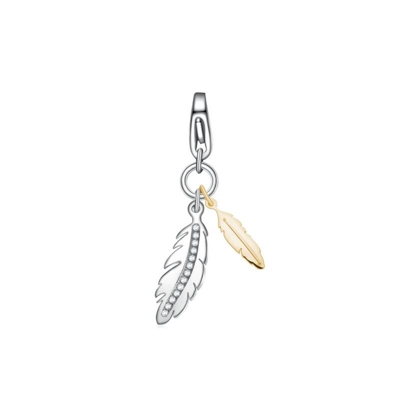 Charm in acciaio 316L con due pendenti a forma di piume, cristalli bianchi e pvd oro.