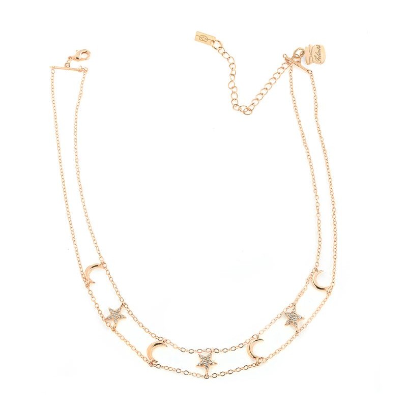 Collana Piti Malì Choker, in argento placcato oro rosa, impreziosito da stelle e da lune tempestate di zirconi bianchi . Lunghezza massima 38 centimetri, con anelletti per accorciarla. Chiusura a moschettone.