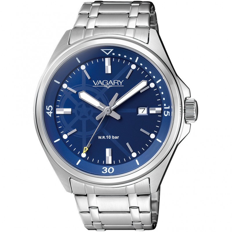 Orologio Solo Tempo Da Uomo Vagary By Citizen Collezione Aqua39. Modello Con Cassa In Acciaio Con Fondo A Vite, Del Diametro Di 42 Mm, E Quadrante Blu Con Indici . Bracciale In Acciaio Con Chiusura A Pulsante. Resistenza All'Acqua Di 10 Atm, Movimento Al Quarzo Citizen. Calibro G111, Datario E Vetro Minerale