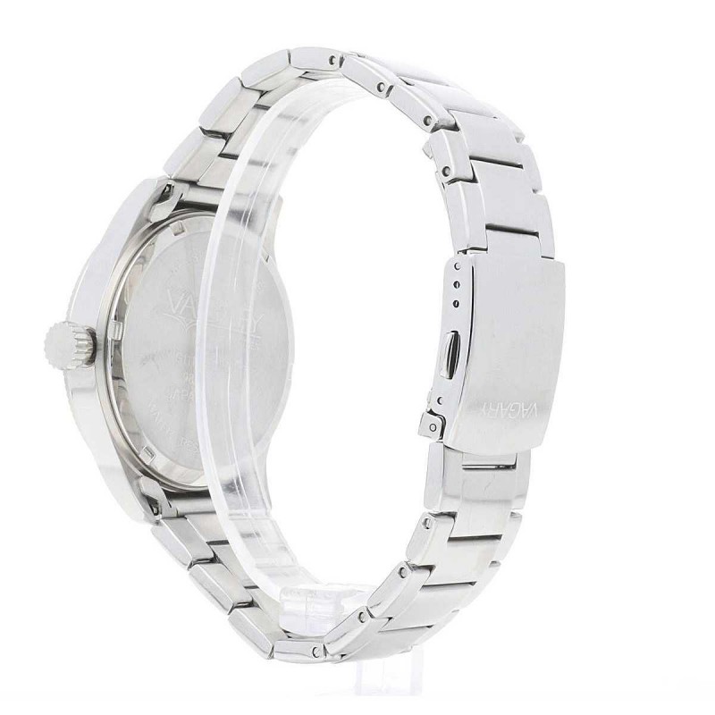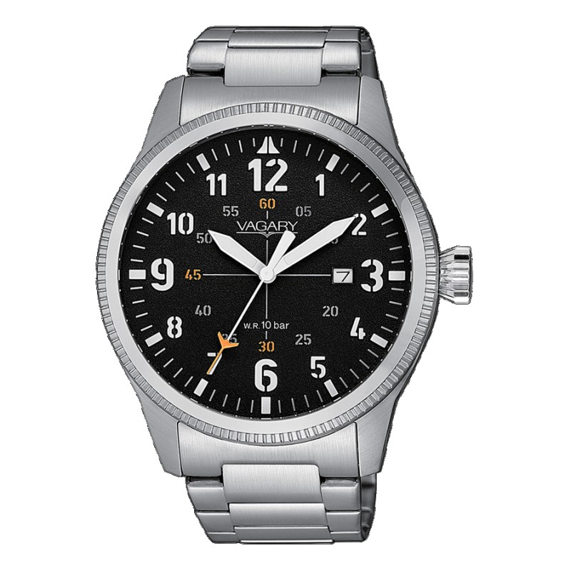 Orologio Solo Tempo Da Uomo Vagary By Citizen Collezione Fly Boy Con Cassa In Acciaio Con Fondo Serrato A Vite. Diametro Cassa Di 42Mm. Quadrante Nero Con Numeri Arabi. cinturino In Acciaio Con Chiusura A Pulsante. Resistenza All'Acquai Di 10 Atm. Movimento: Al Quarzo Citizen Cal G111. con Datario e Vetro Minerale.
