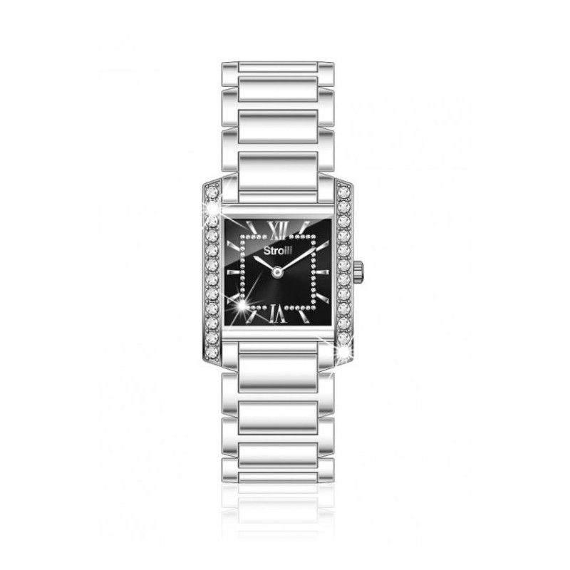 Orologio Stroili collezione Westminster analogico solo tempo movimento al quarzo cassa dimensioni 20x28 con cristalli bianchi e cinturino in acciaio silver quadrante nero con cristalli bianchi resistente all'acqua fino a 3 ATM