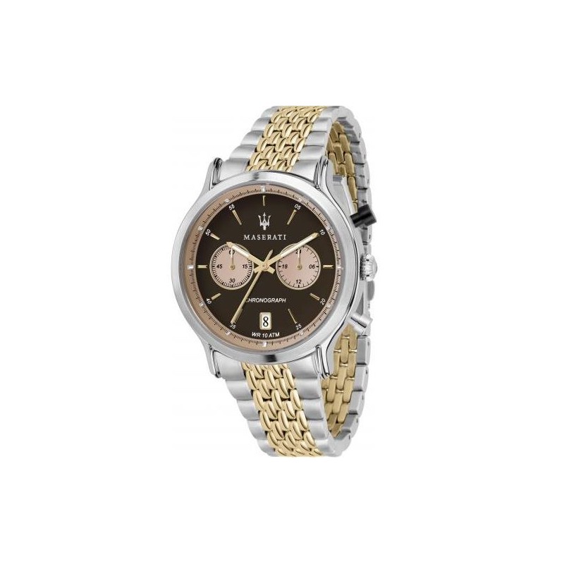 Orologio Cronografo Da Uomo Maserati Collezione Legend Con Cassa In Acciaio E Pvd Oro Misura Di 48,4X42Mm E Cinturino In Acciaio con Vetro Minerale. Orologio Con movimento Vk64 5H Date 6H Black B/G L Height.e Resistenza All'Acqua Di 10 Atm.