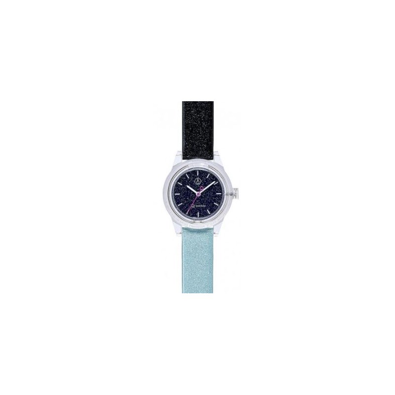 Orologio Solo Tempo Da Donna Smile Solar Collezione Mini Glitter. Con Cassa In Resina Abs Monoscocca Del Diametro Di 32 Mm, Quadrante nero glitterato Con Indici A Tacche E Cinturino In Resina Reciclata Glitterato Di Colore nero e celeste E Fibbia Ad Ardiglione. Orologio Dotato Di Movimento A Carica Solare E Resistenza All'Acqua Di 10 Atm.