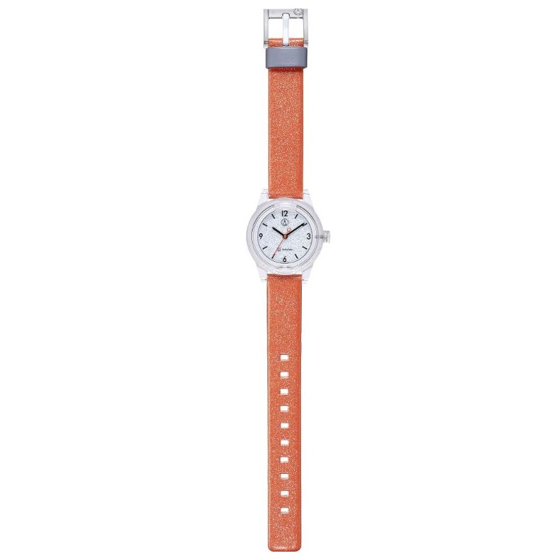 Orologio Solo Tempo Da Donna Smile Solar Collezione Mini Glitter. Con Cassa In Resina Abs Monoscocca Del Diametro Di 32 Mm, Quadrante bianco glitterato Con Indici A Tacche E Cinturino In Resina Riciclata Glitterato Di Colore arancione E Fibbia Ad Ardiglione. Orologio Dotato Di Movimento A Carica Solare E Resistenza All'Acqua Di 10 Atm.